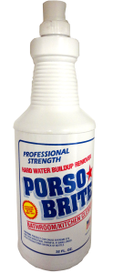 Porso Brite is a professional strength premium quality hard water and build up remover. Porso Brite’s unique biodegradable formula, has been used by professional cleaners nationwide as a earth friendly, labor saving cleaner. It’s thick-clinging formula penetrates quickly to remove corrosion, oxidation, soap film, lime and hard water stains, mildew and rust. Can also be used to clean dish washers or washing machines.