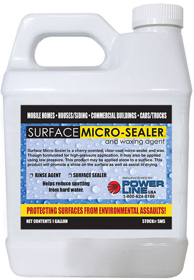 Surface Micro-Sealer is a cherry-scented, clear-coat micro-sealer and wax. Though formulated for high pressure application, it may also be applied using low pressure. This product may be applied alone to a surface. This product will promote a shine on the surface as well as assist in drying. A highly concentrated,special blend of active ingredients that rinse easily to leave a uniform, glossy, protective film that is bonded to finishes. Adds luster to home exteriors, vehicles, and decreases drying time due to improved beading of rinse water. Protects finishes against rust, corrosive salts, and oxidation. Cationic, non-petroleum base, contains no solvent. Will not leave film on windows. Super high dilution rate.